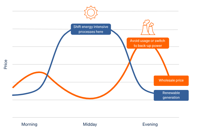 This low-cost energy can be stored, and later used when prices are high, helping businesses reduce usage from the grid during price spikes. High prices typically coincide with periods when thermal generators, like coal, make up a higher proportion of the grid fuel mix in order to meet demand.