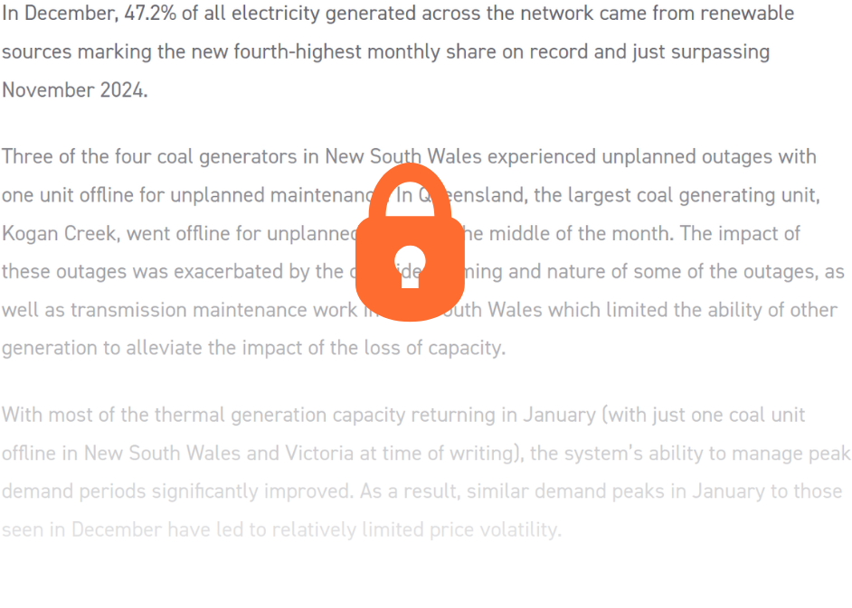 The month could be described as one of two halves. A reprieve from hot weather, generation capacity coming back online, and the expected drop in demand going into the Christmas and New Year period led to a significant drop in spot prices. The average price in the second half of the month decreased by 55% in Queensland, 67% in New South Wales, 75% in Victoria, and 78% in South Australia.