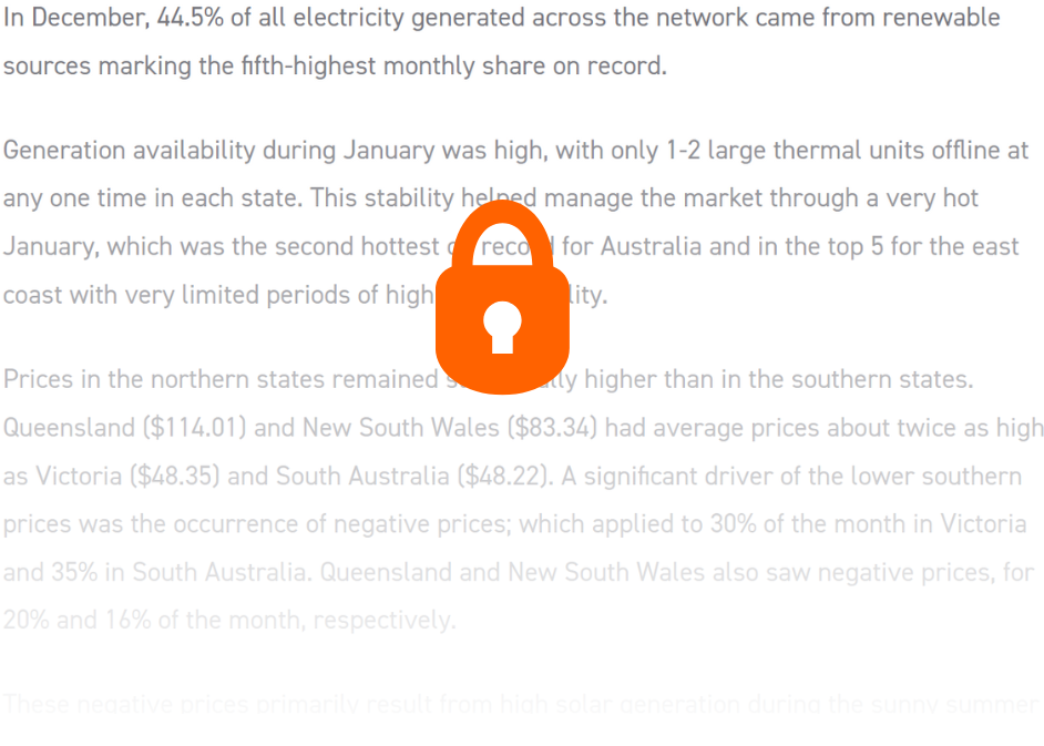 The highest monthly price was recorded in Queensland at $114.01 ($0.38 higher than Tasmania). A new all-time maximum demand record for Queensland was set on 22nd of January, followed by a third-highest maximum demand record two days later the 24th of January. The peak demand on the 22nd of January was ~500MW higher than forecast, which took both AEMO and the market by surprise. This triggered a surge in spot prices above $10,000, lasting almost two hours and underscoring the unpredictability of demand during extreme conditions.