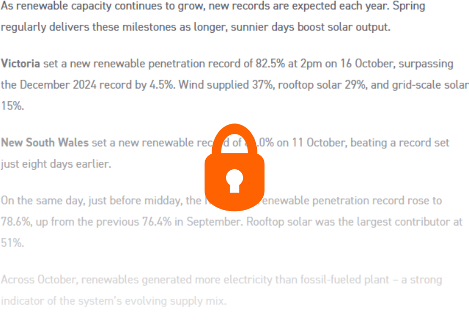 Negative spot prices were common across the NEM – particularly during solar hours, windy periods and weekends. Prices were negative 26% of the time in New South Wales, 32% in Queensland, 42% in Victoria, and 46% in South Australia. Driven by abundant renewable generation, this prevalence of negative prices saw Tasmania, South Australia and Victoria record the lowest average prices for the month. Tasmania continued to benefit from strong hydro availability and restricted flows to the mainland.