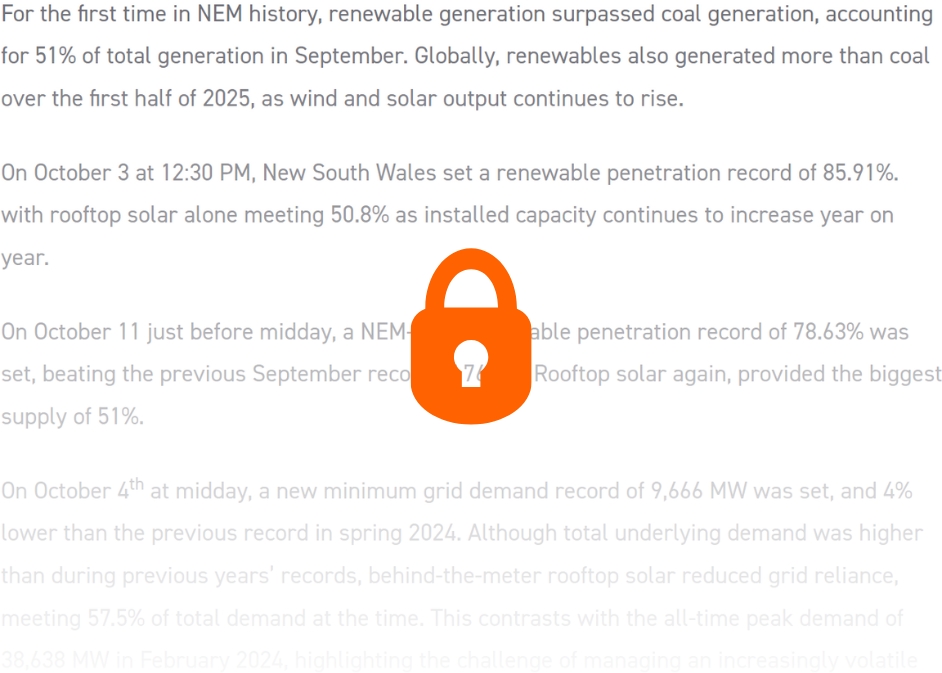 Electricity prices across the National Electricity Market (NEM) fell sharply from August to September, with all mainland states (Queensland, New South Wales, Victoria and South Australia) recording declines between 30-40%, and Tasmania experiencing a dramatic 77% drop (driven largely by stronger hydro output, thanks to wetter conditions). The spring shoulder season brought warmer weather, lower demand, sunnier skies, and strong winds, combining to drive average prices lower and increase the occurrence of negative prices.